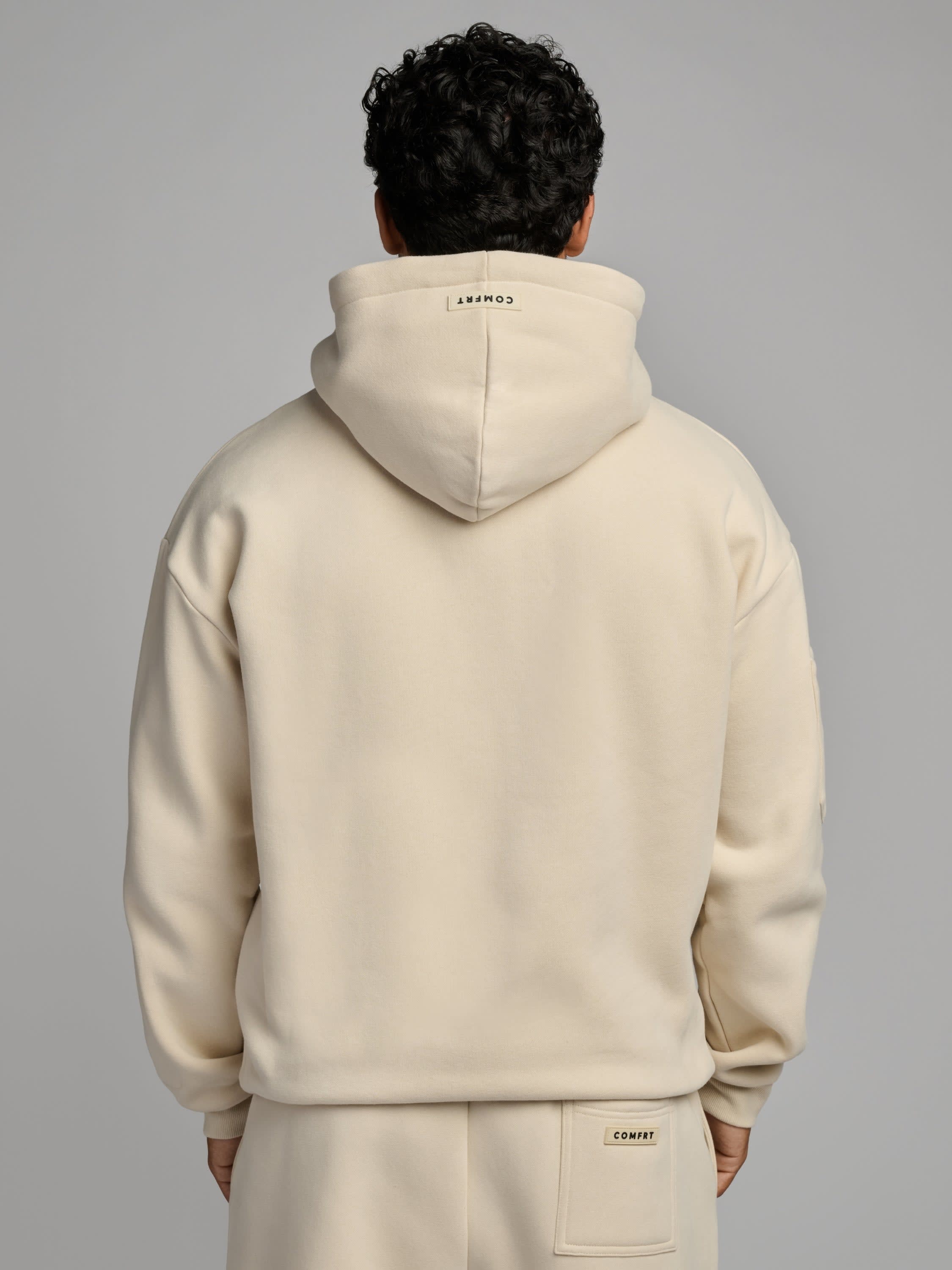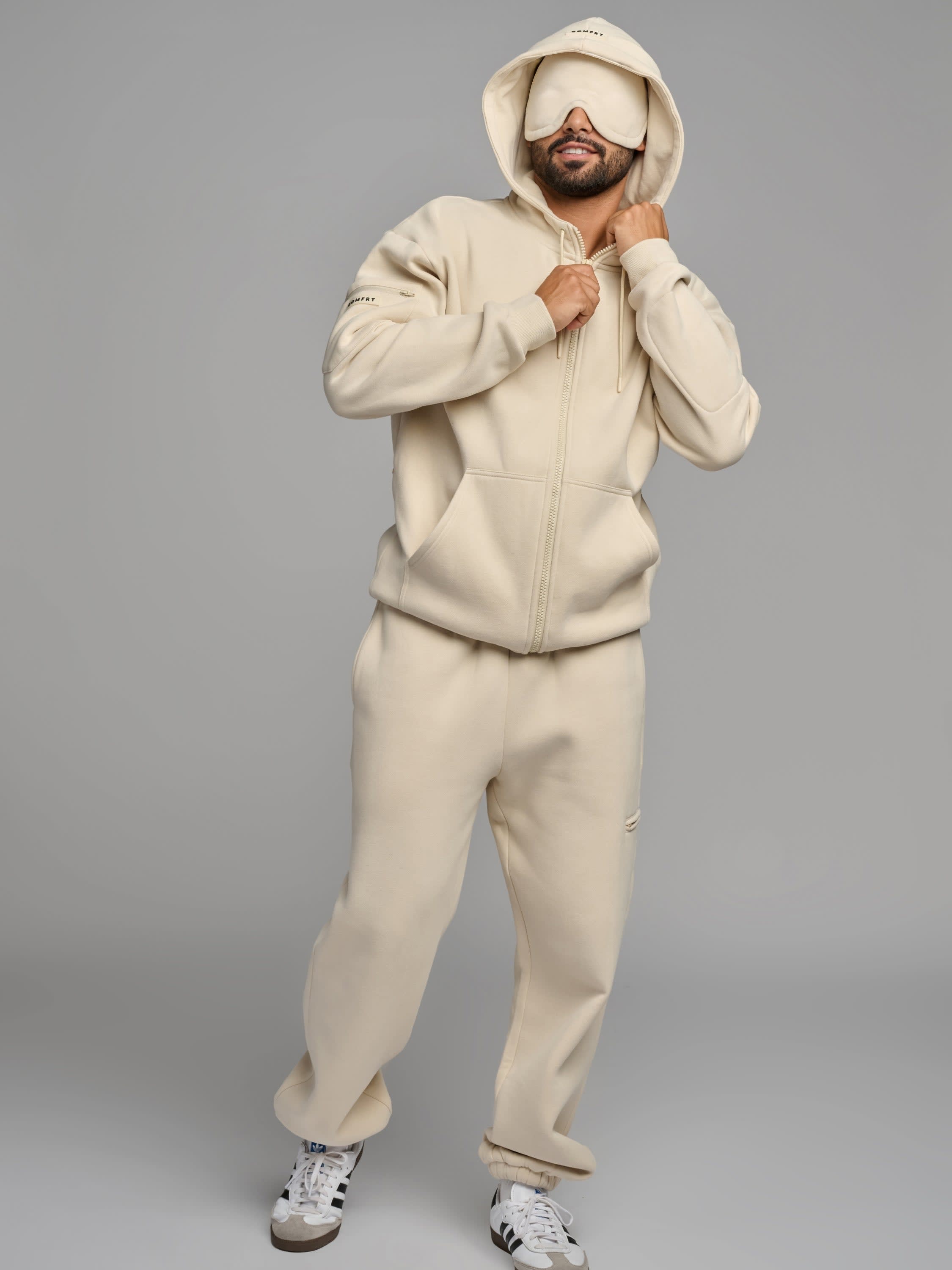 A built-in contoured eyemask lets you rest undisturbed, while zip sleeve pockets keep essentials like your AirPods close. Hidden compartments inside the kangaroo pocket discreetly store your passport and valuables. Finished with an oversized, double-lined hood, this piece redefines travel comfort in motion.