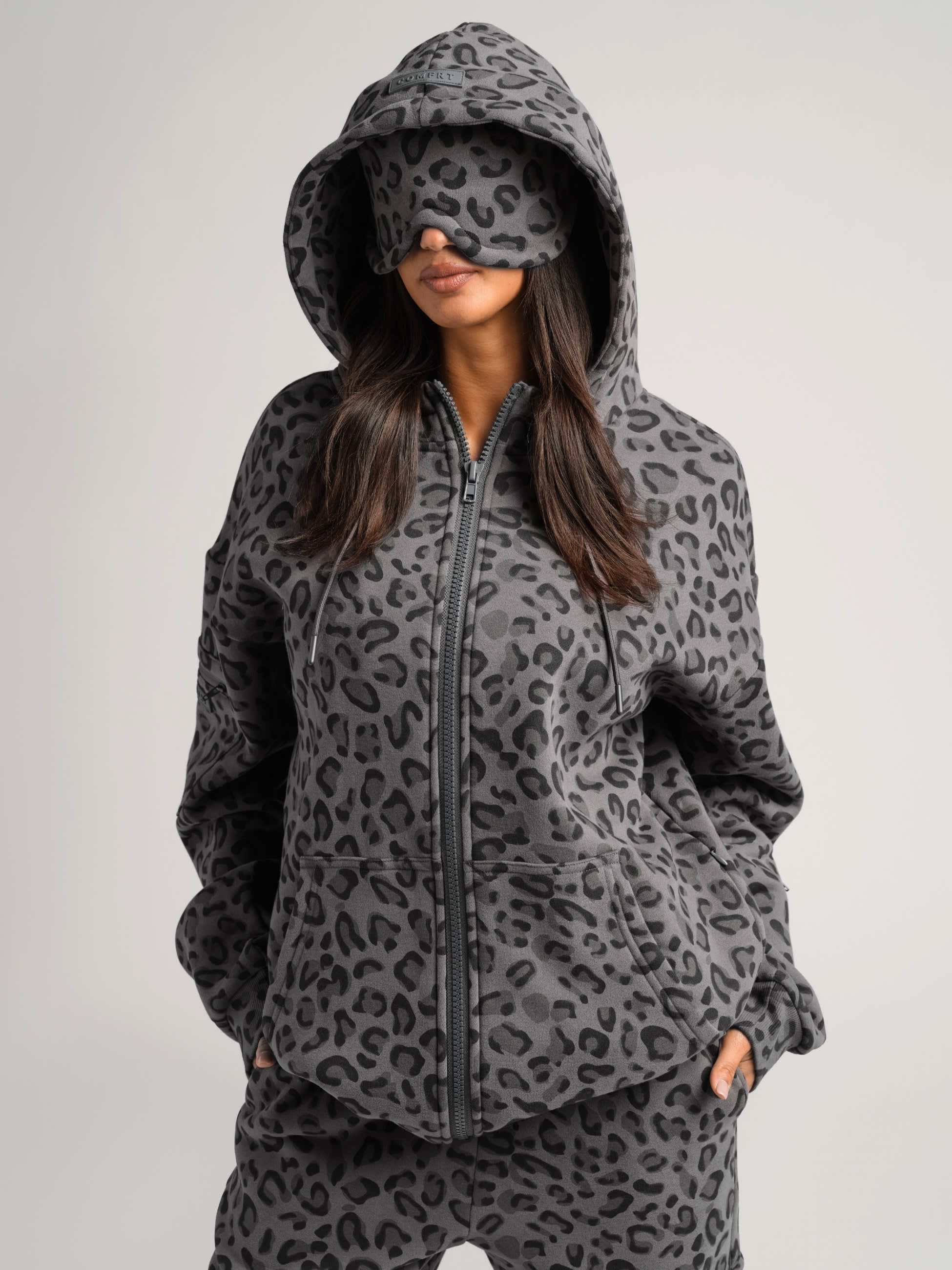 A built-in contoured eyemask lets you rest undisturbed, while zip sleeve pockets keep essentials like your AirPods close. Hidden compartments inside the kangaroo pocket discreetly store your passport and valuables. Finished with an oversized, double-lined hood, this piece redefines travel comfort in motion.