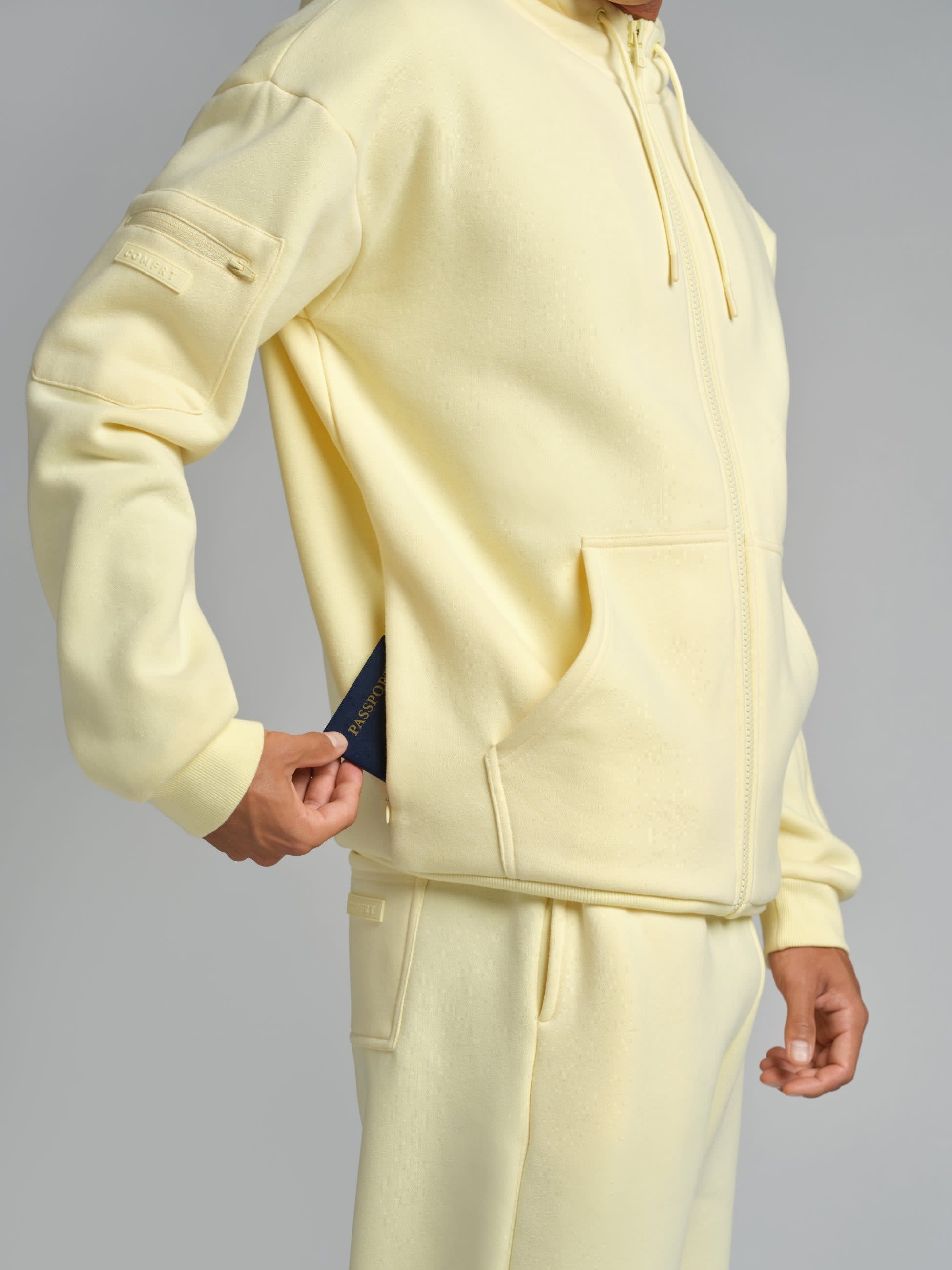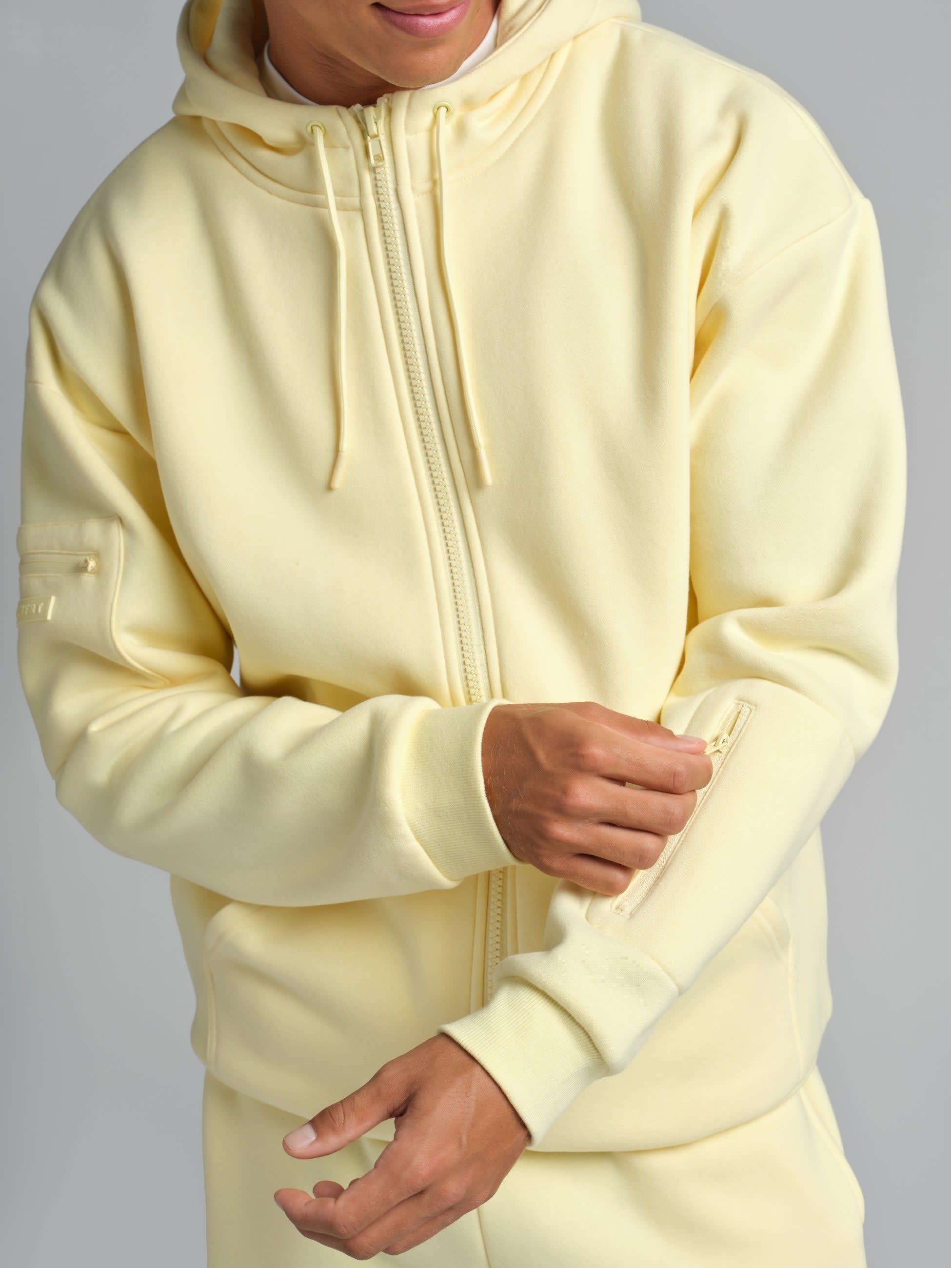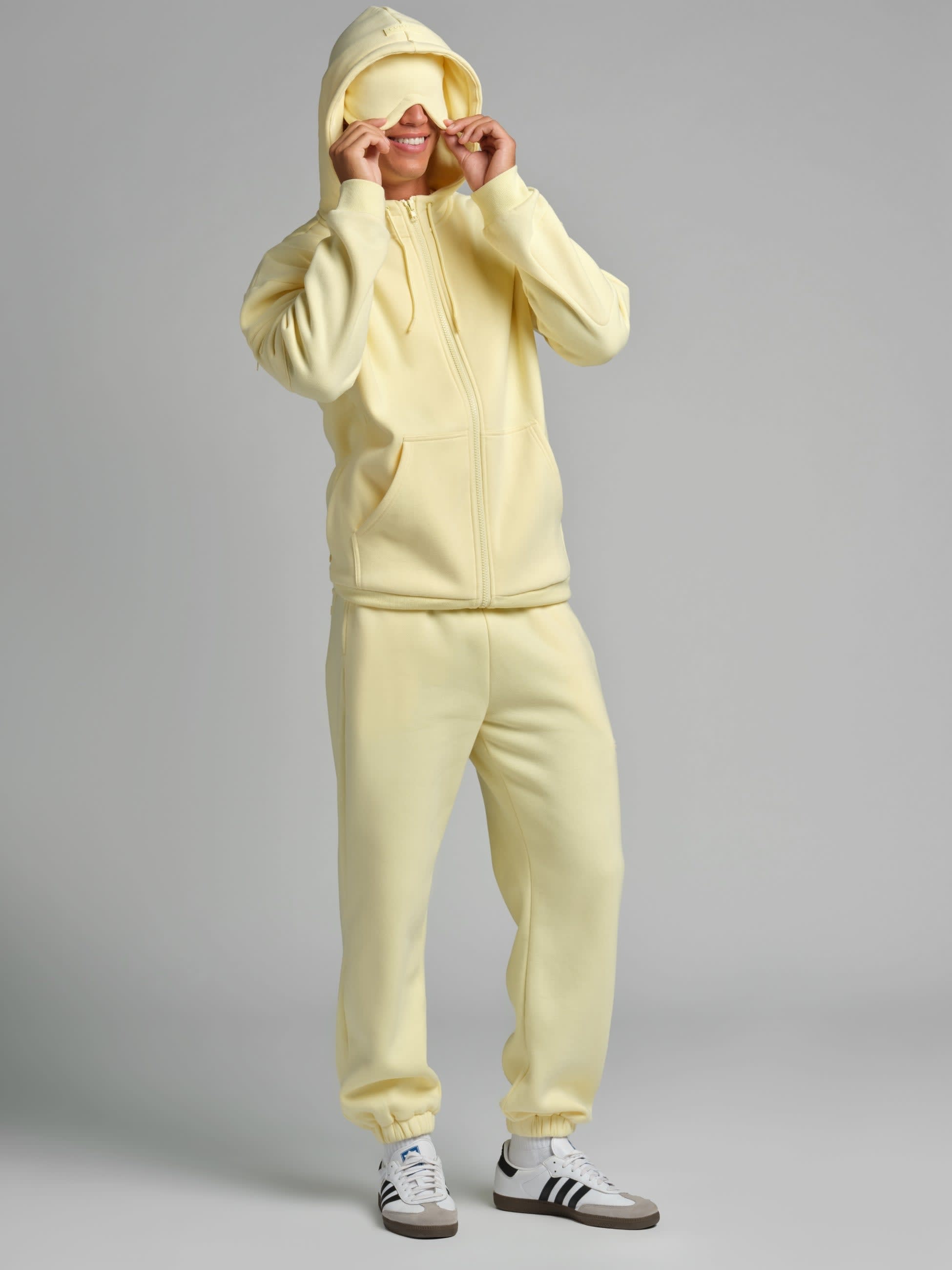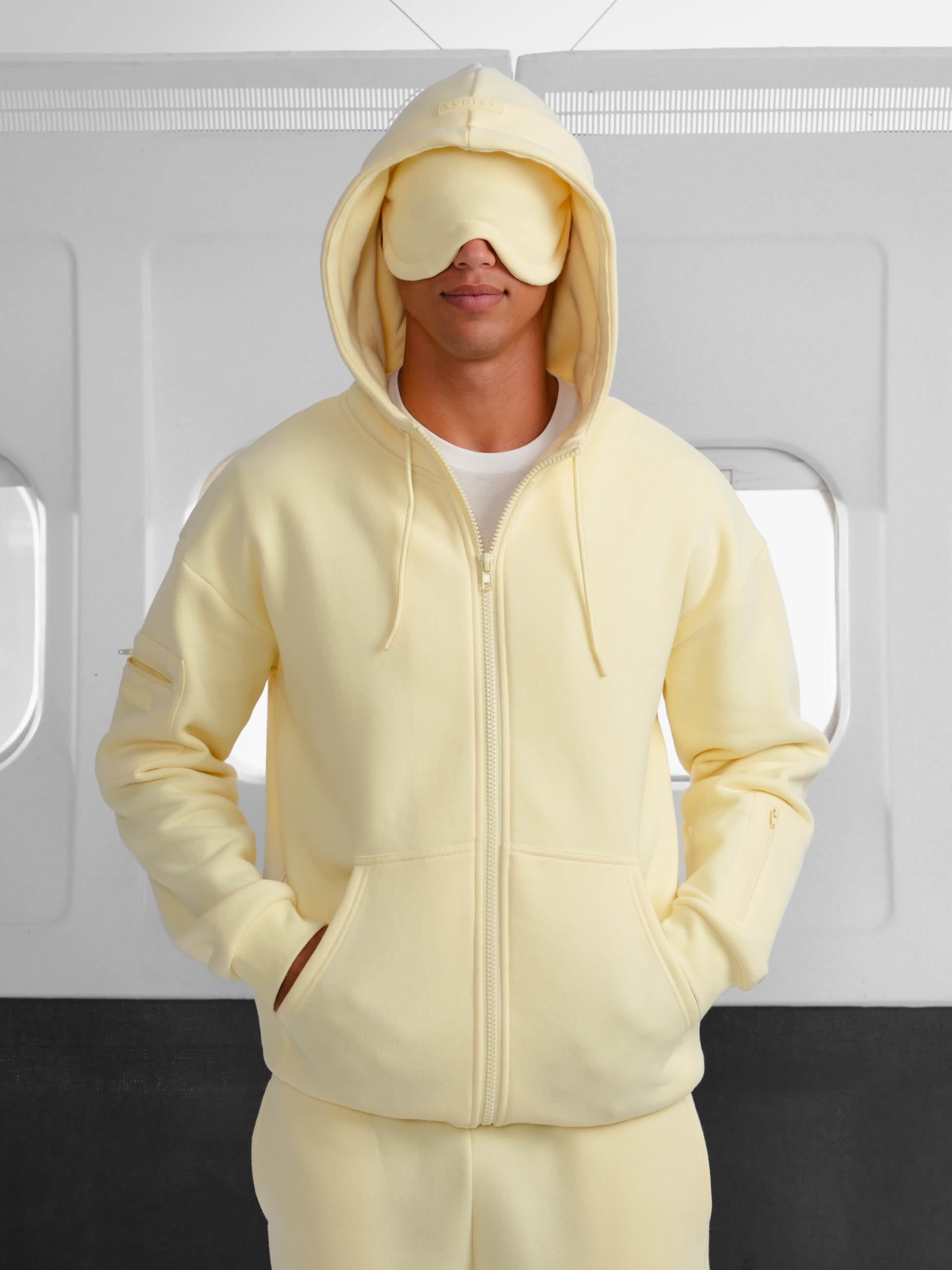 A built-in contoured eyemask lets you rest undisturbed, while zip sleeve pockets keep essentials like your AirPods close. Hidden compartments inside the kangaroo pocket discreetly store your passport and valuables. Finished with an oversized, double-lined hood, this piece redefines travel comfort in motion.