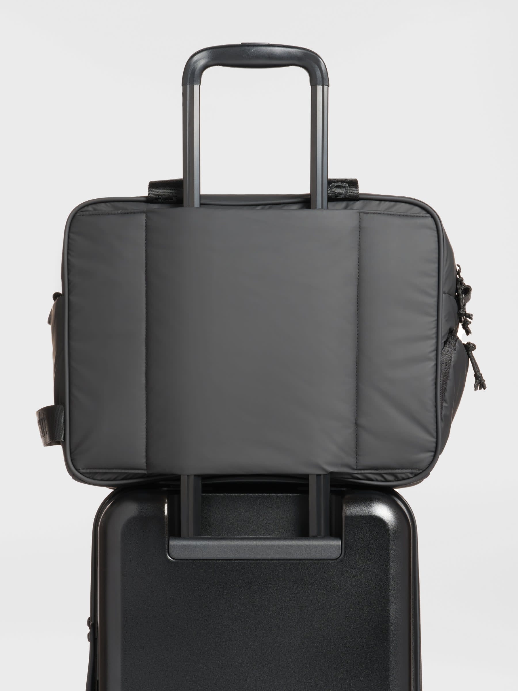 The laptop sleeve fits up to 15 inches so it pulls double duty as a work bag and laptop travel bag. The luggage sleeve slides right onto your suitcase handle making it the smoothest weekender bag you've ever traveled with, and the waterproof duffel bag construction means a little rain or a spilled coffee isn't a crisis.