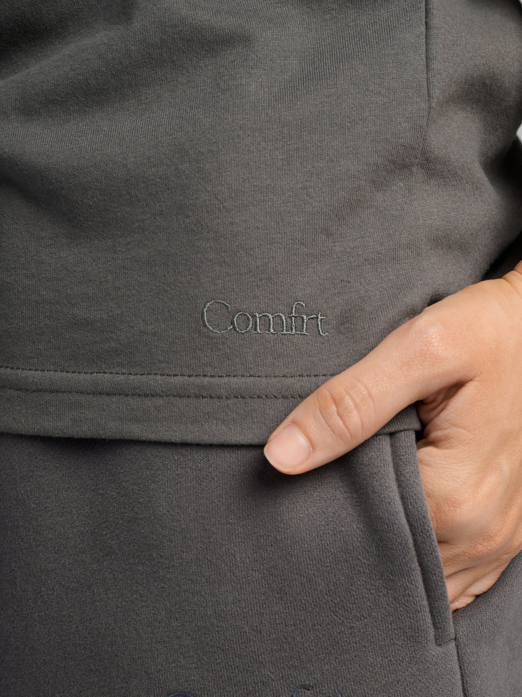 • Embroidered Comfrt logo near the hem for a subtle touch of style