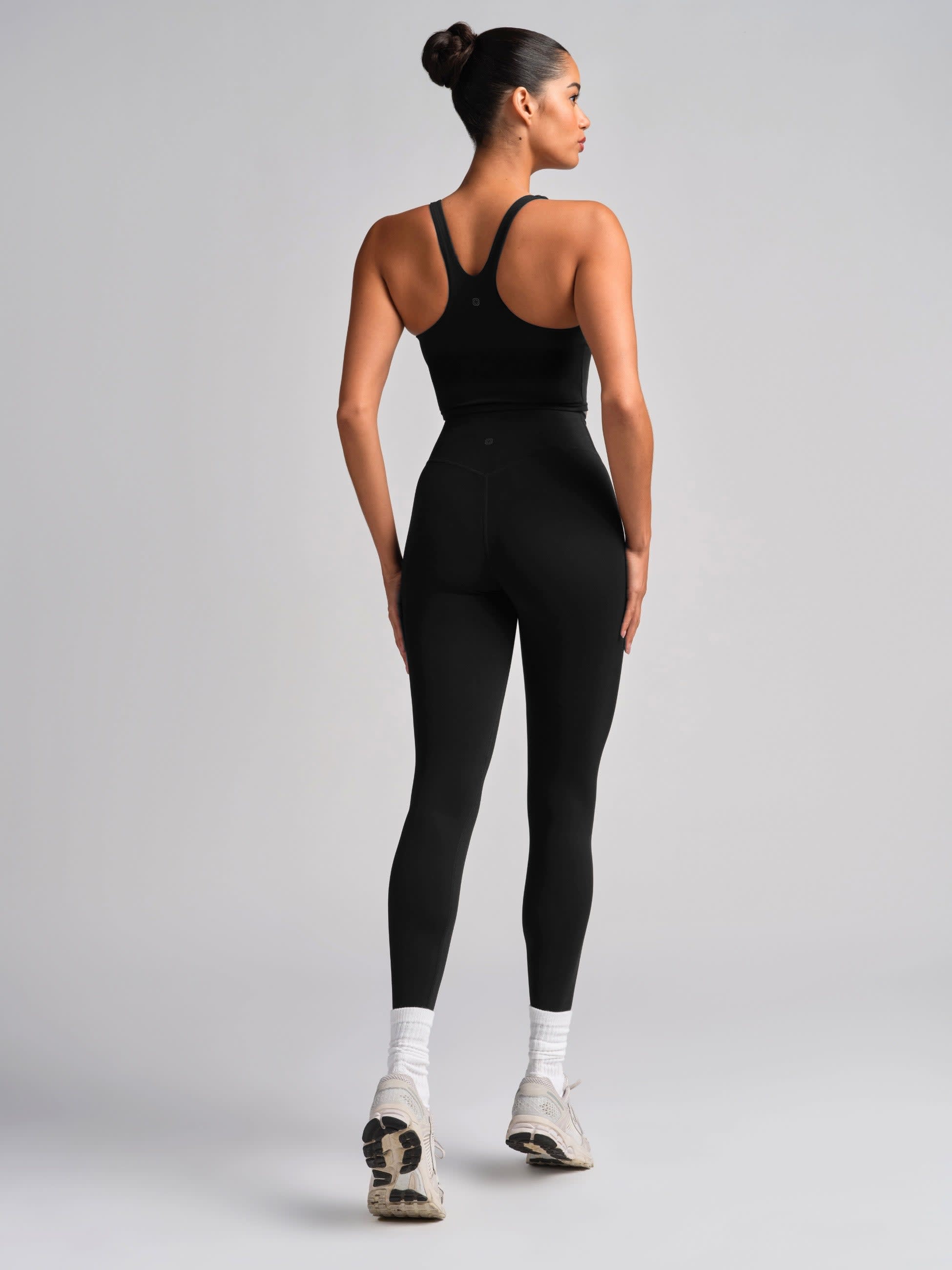 Fitted crop top silhouette with built-in shelf bra. Hits above the waist. Support: Light to Medium — A gentle, barely there fit for a light medium compressive feel.