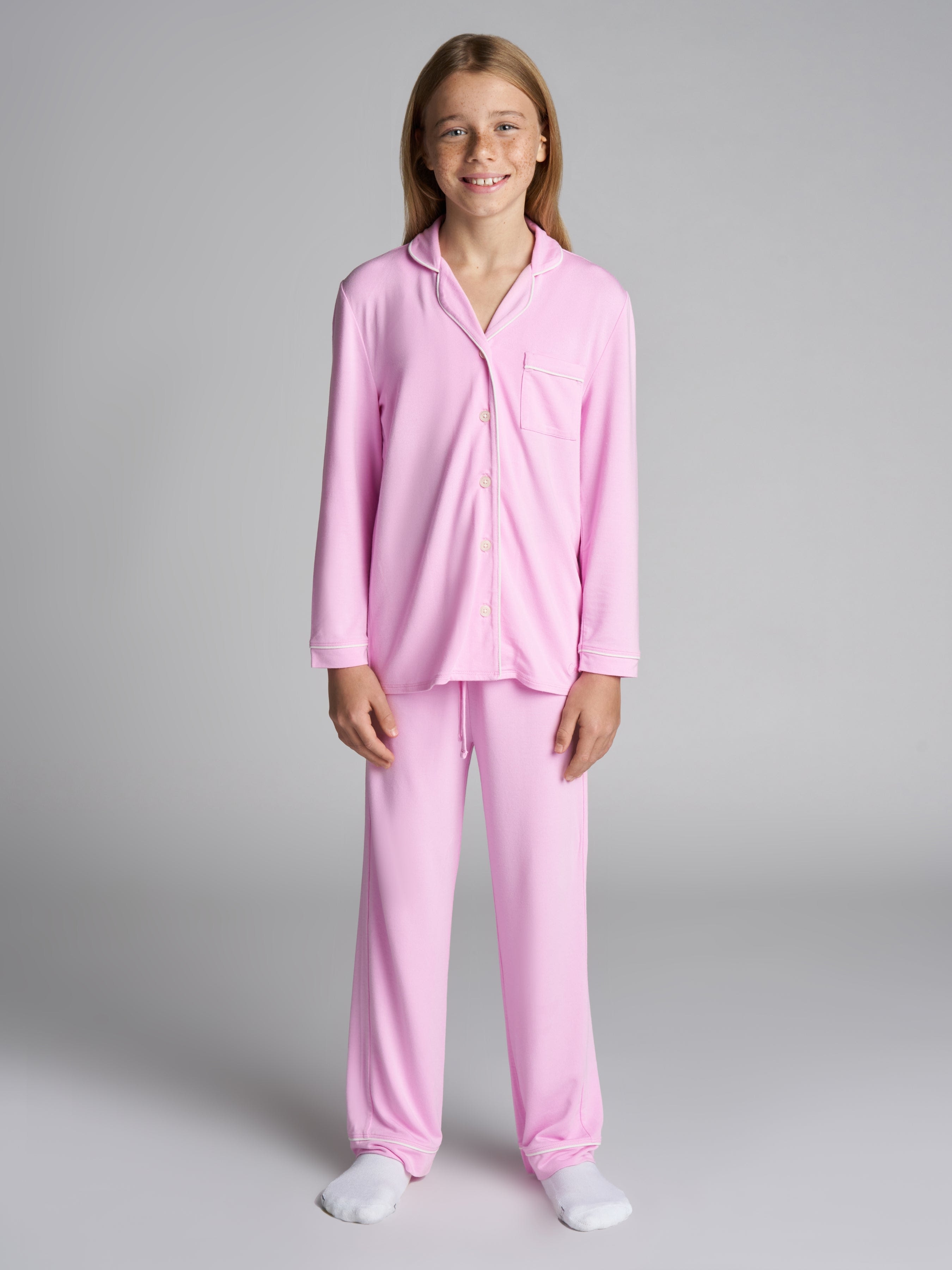 The top features a classic collar, easy button-front, and chest pocket with contrast piping for a polished touch. Matching pants have a relaxed fit and comfy elastic waistband so they can move, stretch, and play with ease.