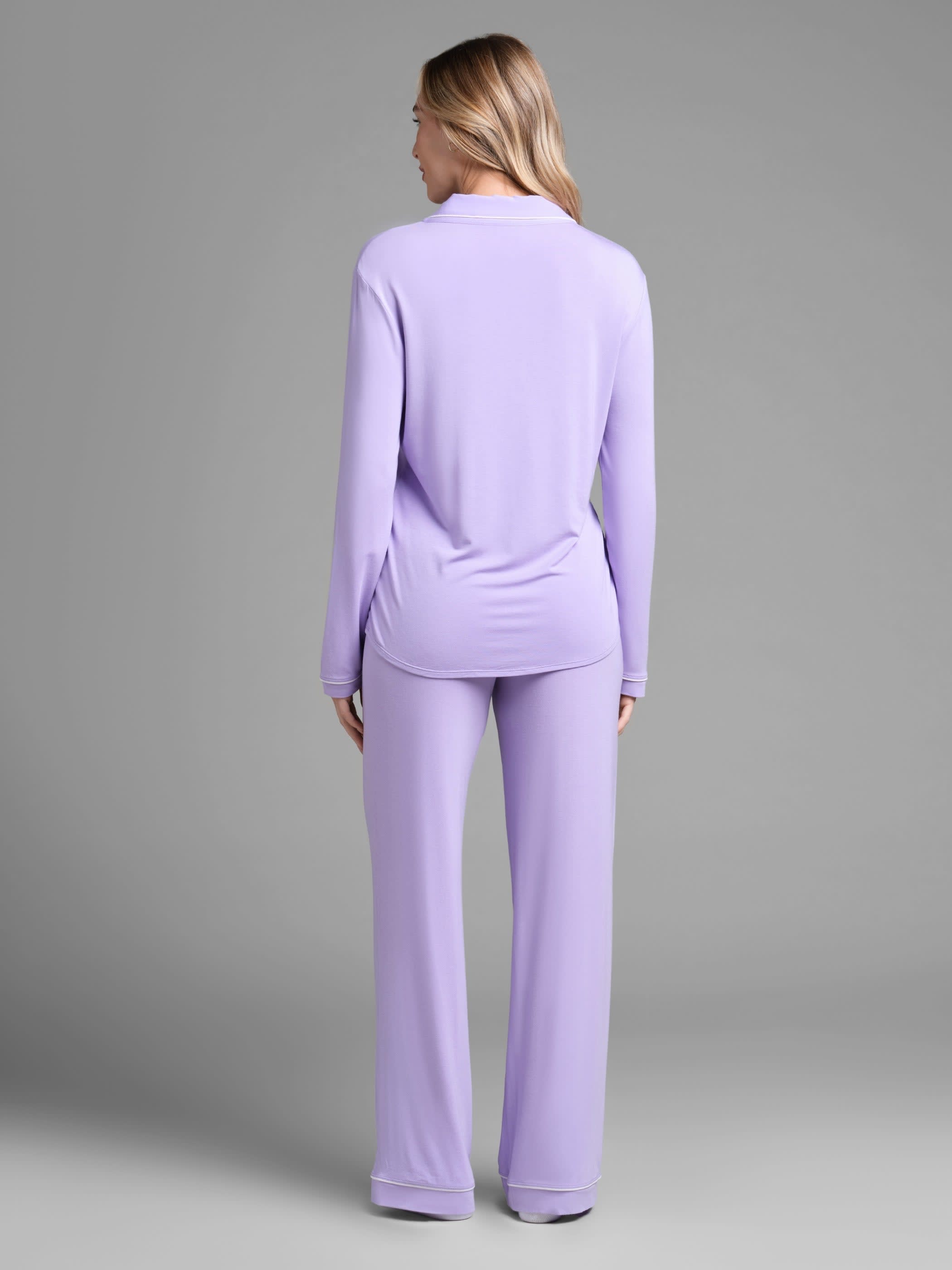 The top features a classic notched collar, button-front closure, and patch pocket, all finished with contrast piping for an elevated look. Matching pants are relaxed with an elastic waistband and coordinating piping details for effortless polish.