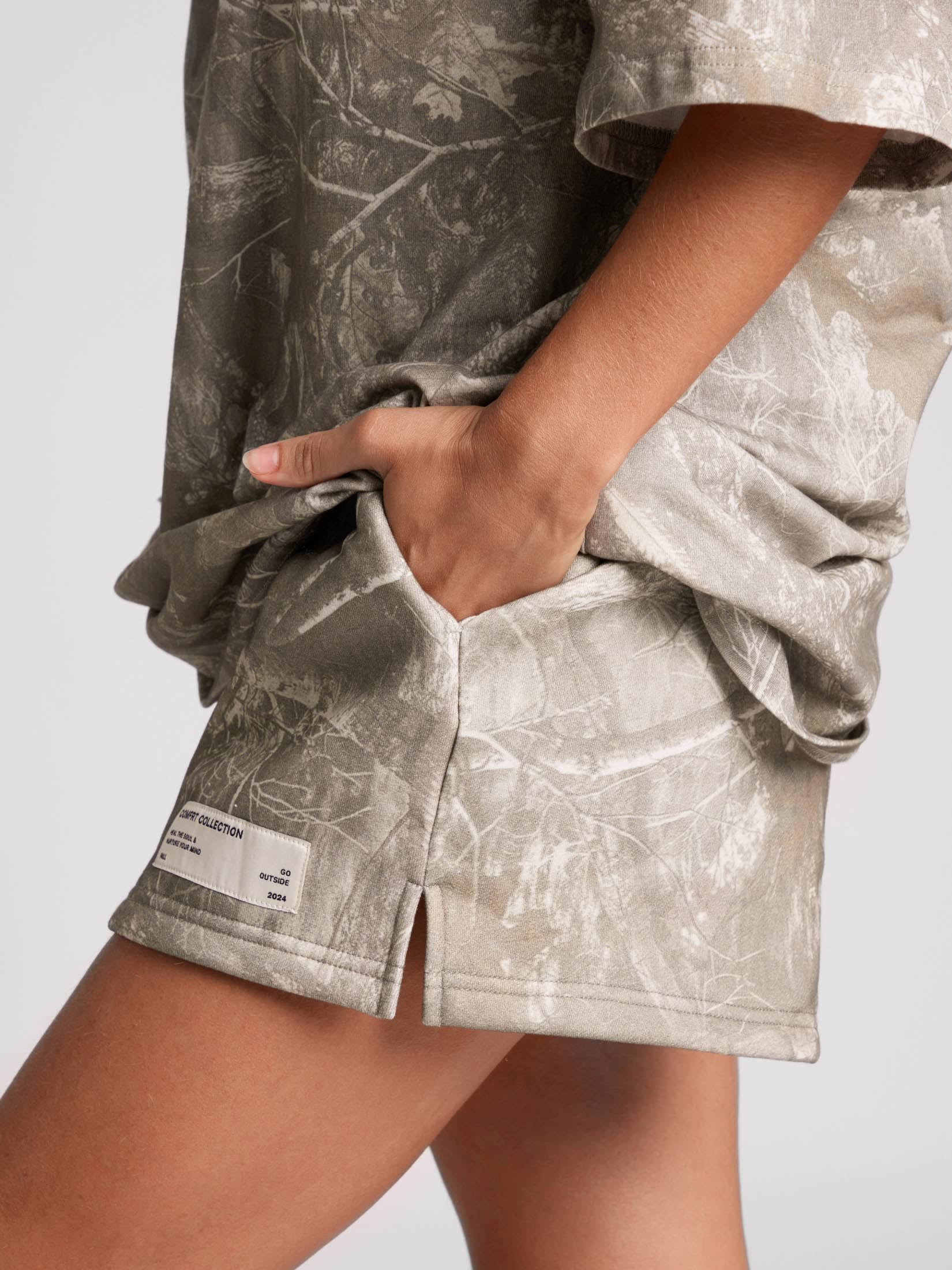 Designed for laid-back comfort with a nod to nature, Our Camo shorts feature an easy, relaxed fit with an elastic drawcord waistband, side pockets and the most comfortable fit. Made from ultra-soft fleece, they’re your go-to for lounging, layering, or getting outside. Pair them with our matching Camo Essential Tee for a full camo moment—Comfrt style.