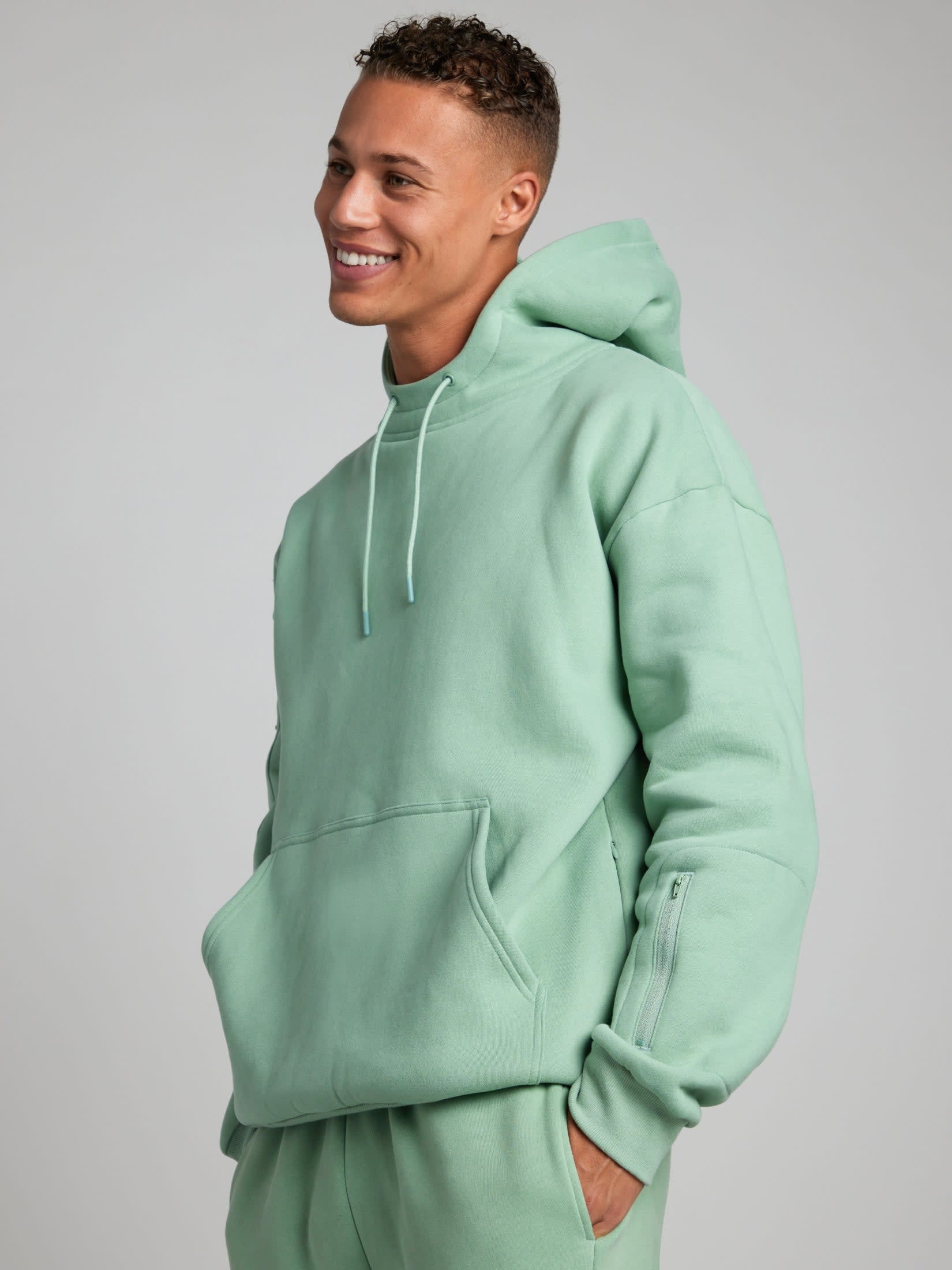 Zip sleeve pockets keep your AirPods within reach. Hidden compartments inside the kangaroo pocket lock down your passport, ID, and cash. The oversized double-lined hood wraps you in the kind of comfort that makes a middle seat feel first class.