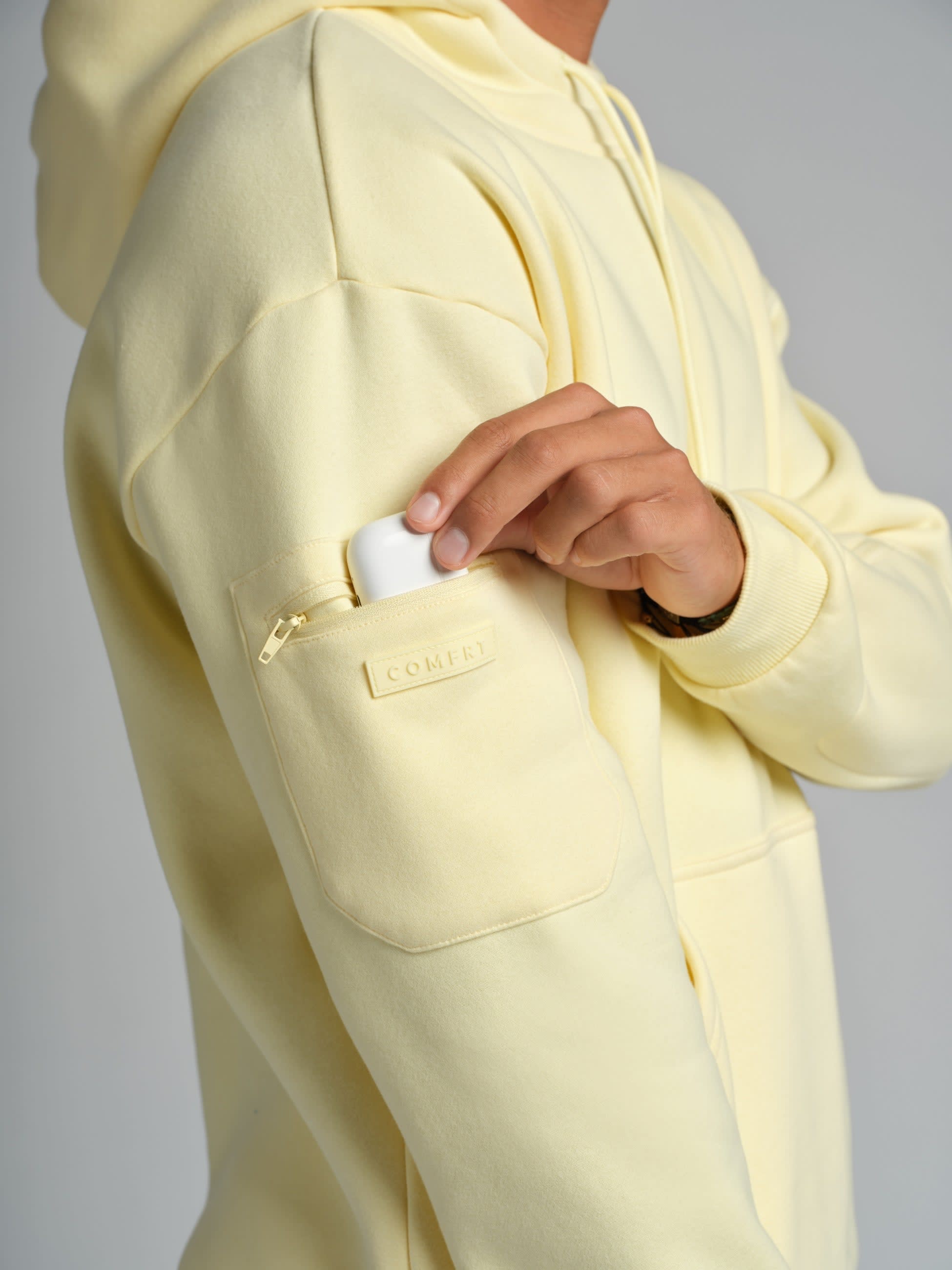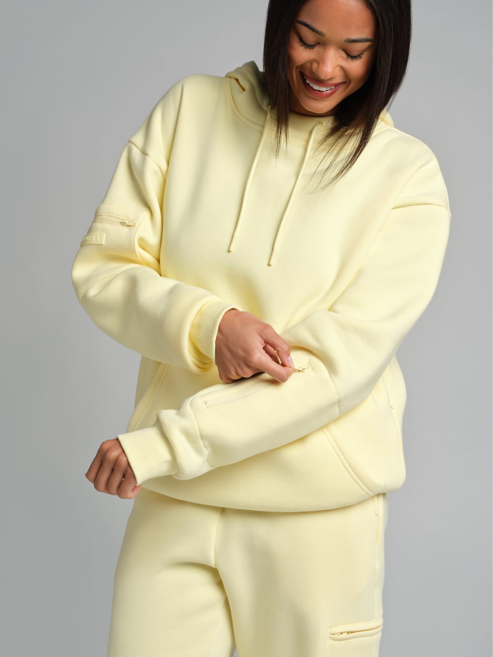 Zip sleeve pockets keep your AirPods within reach. Hidden compartments inside the kangaroo pocket lock down your passport, ID, and cash. The oversized double-lined hood wraps you in the kind of comfort that makes a middle seat feel first class.